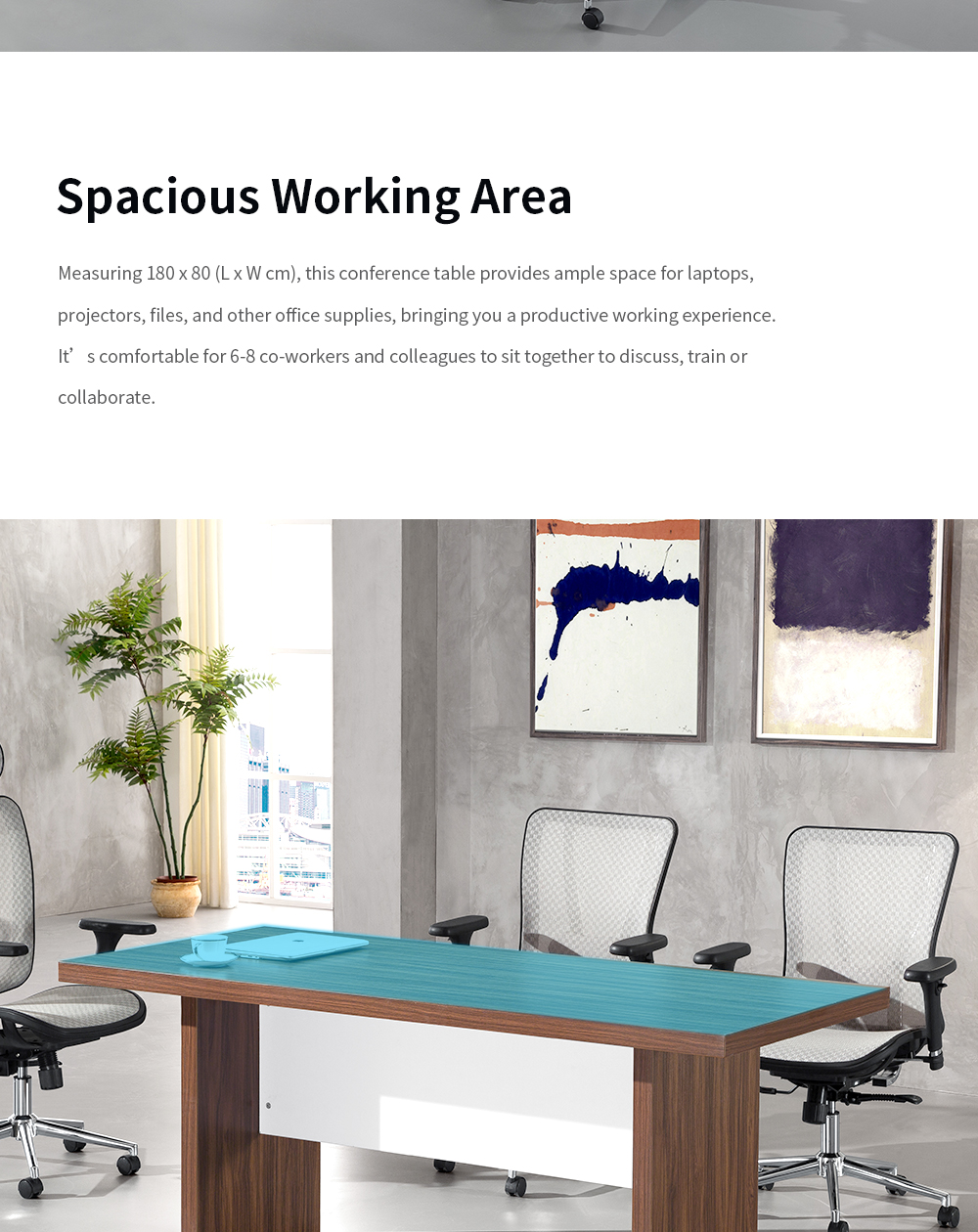 Measuring 180 x 80 (L x W cm), this conference table provides ample space for laptops, projectors, files, and other office supplies, bringing you a productive working experience. It’s comfortable for 6-8 co-workers and colleagues to sit together to discuss, train or collaborate.
