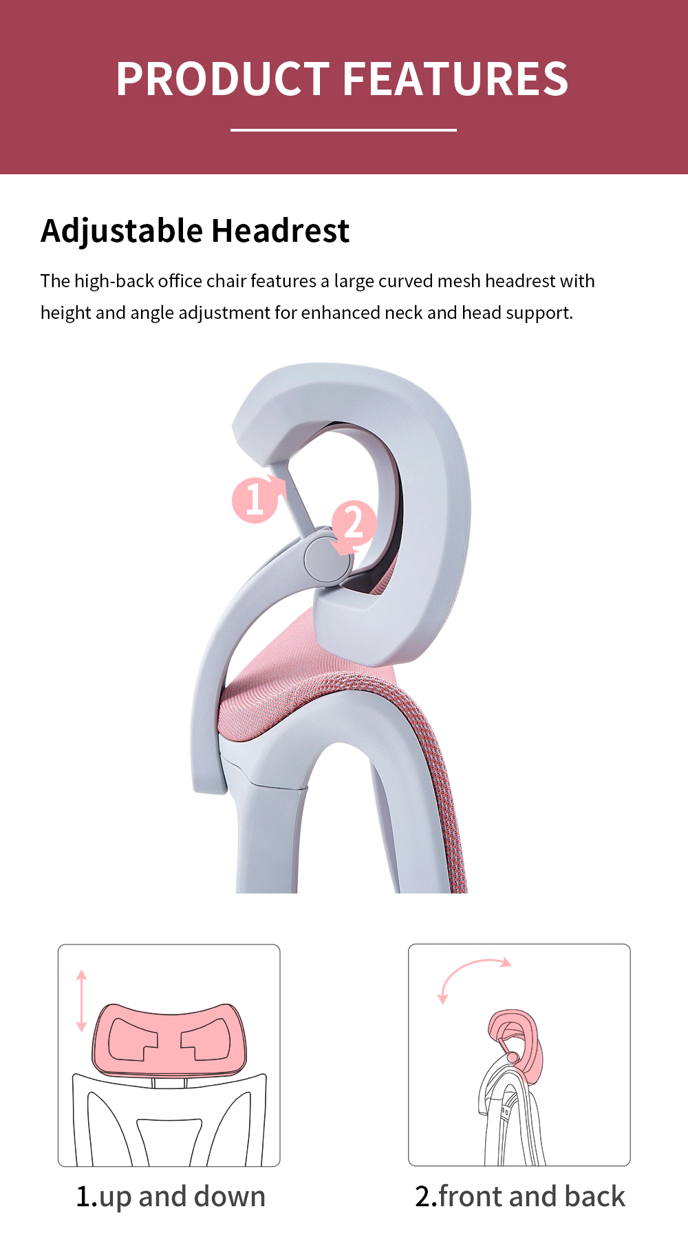 The headrest with adjustable height and angle to meet the support needs of users of different heights and provide comfortable support for the neck.