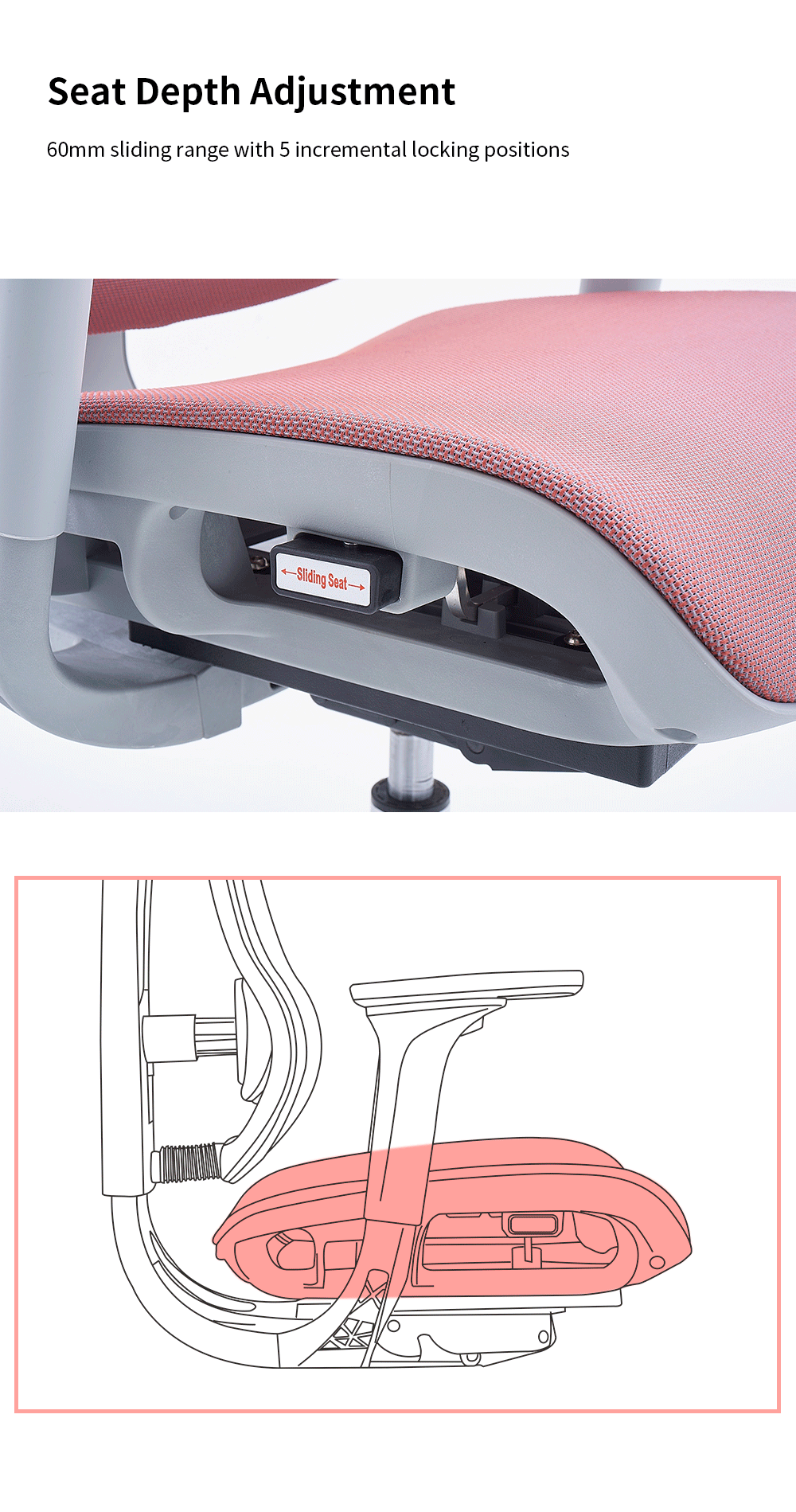 The sliding mesh seat adjusts forward/backward to fit users’ leg lengths, fully supporting thighs, reducing leg/buttock pressure, and boosting overall comfort.