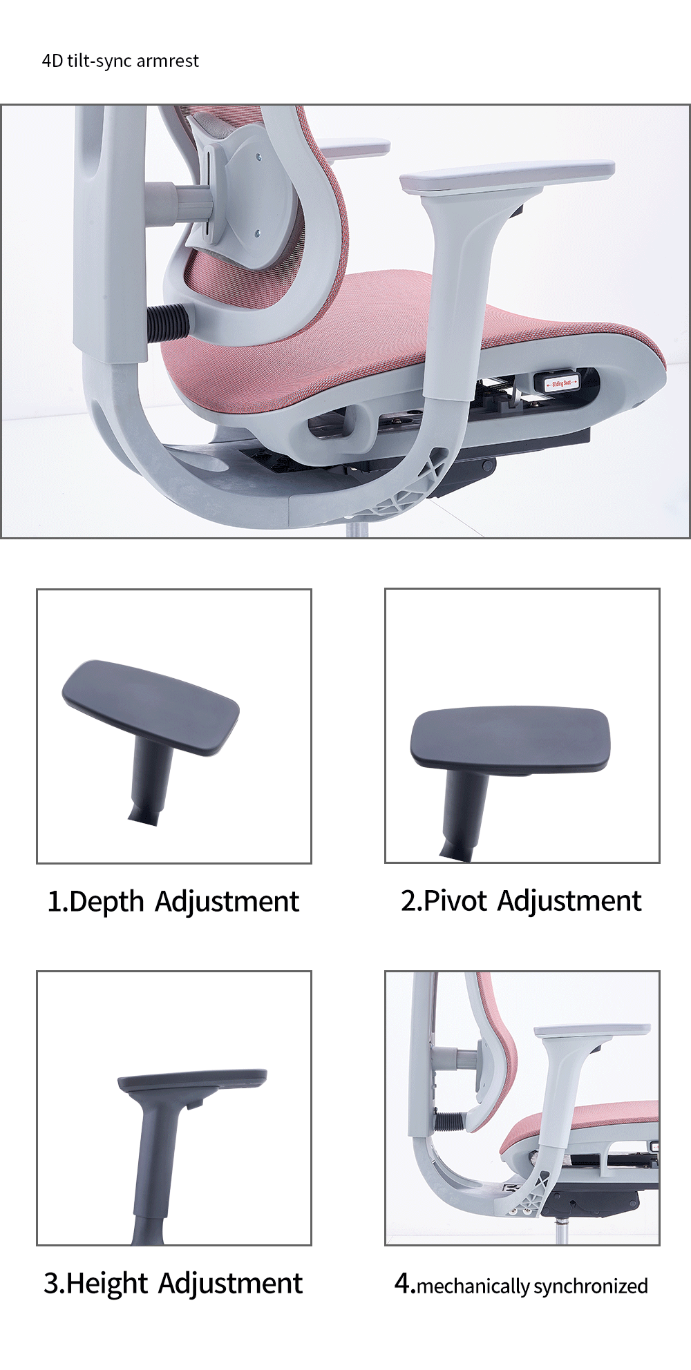 The 4D armrest adjusts multi-dimensionally—up/down, forward/back, and rotation—effectively reducing arm and shoulder pressure.