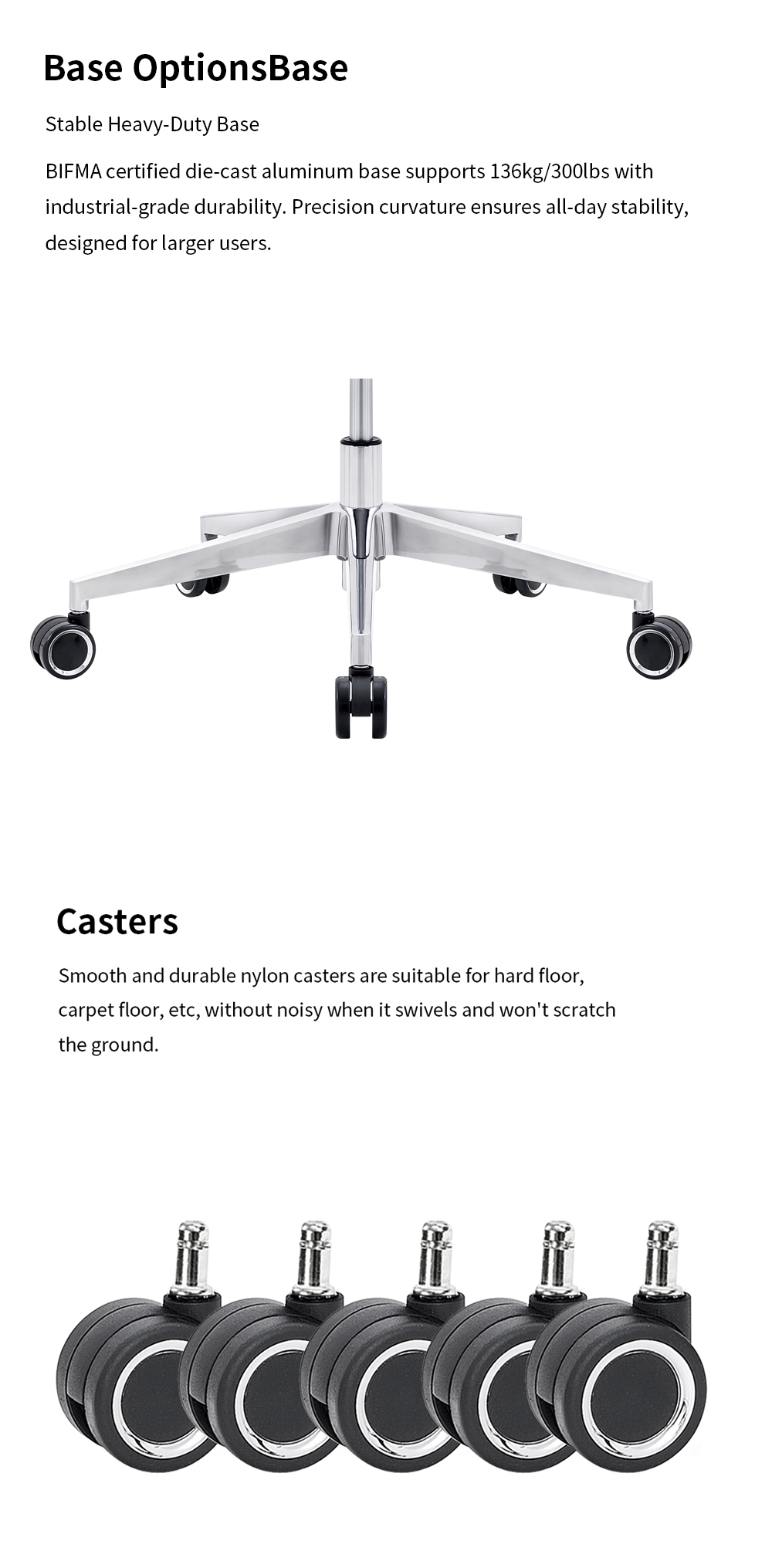 Durable & Reliable: Class 3 gas lift, polished aluminum base, and chromed ring PA casters ensure stable performance, strong load-bearing, and long durability.