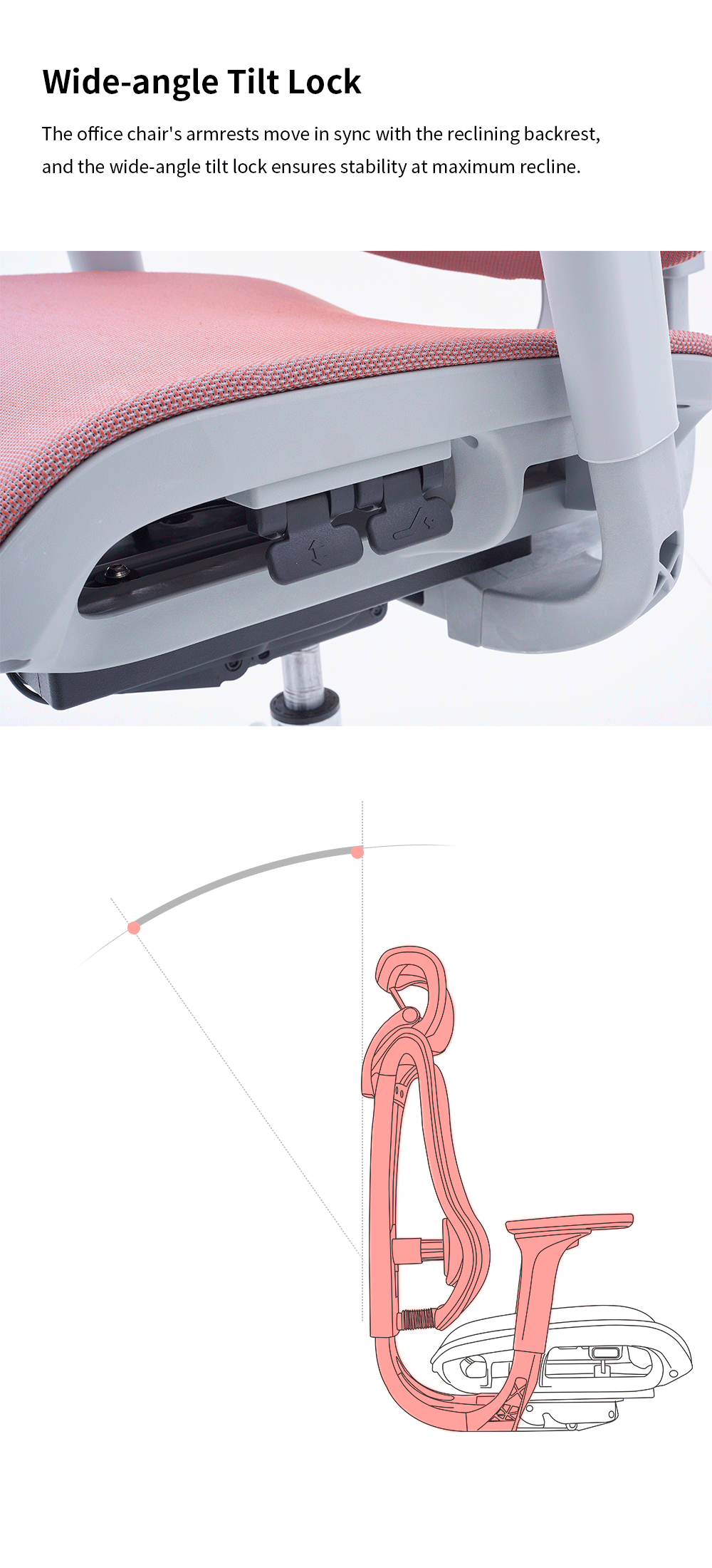 Multi-angle Locking: Wire-controlled 4-level locking chassis locks backrest at 3 angles, switching work/relaxation/rest modes for diverse needs.