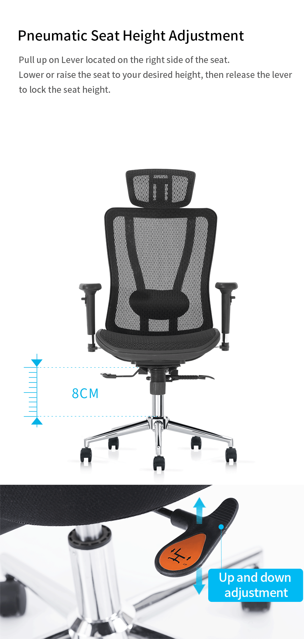 Easy to Adjust: The chair's pneumatic controls allow for easy adjustment of the seat height and backrest tilt, helping you find an ergonomic position that promotes work efficiency and effectiveness.
