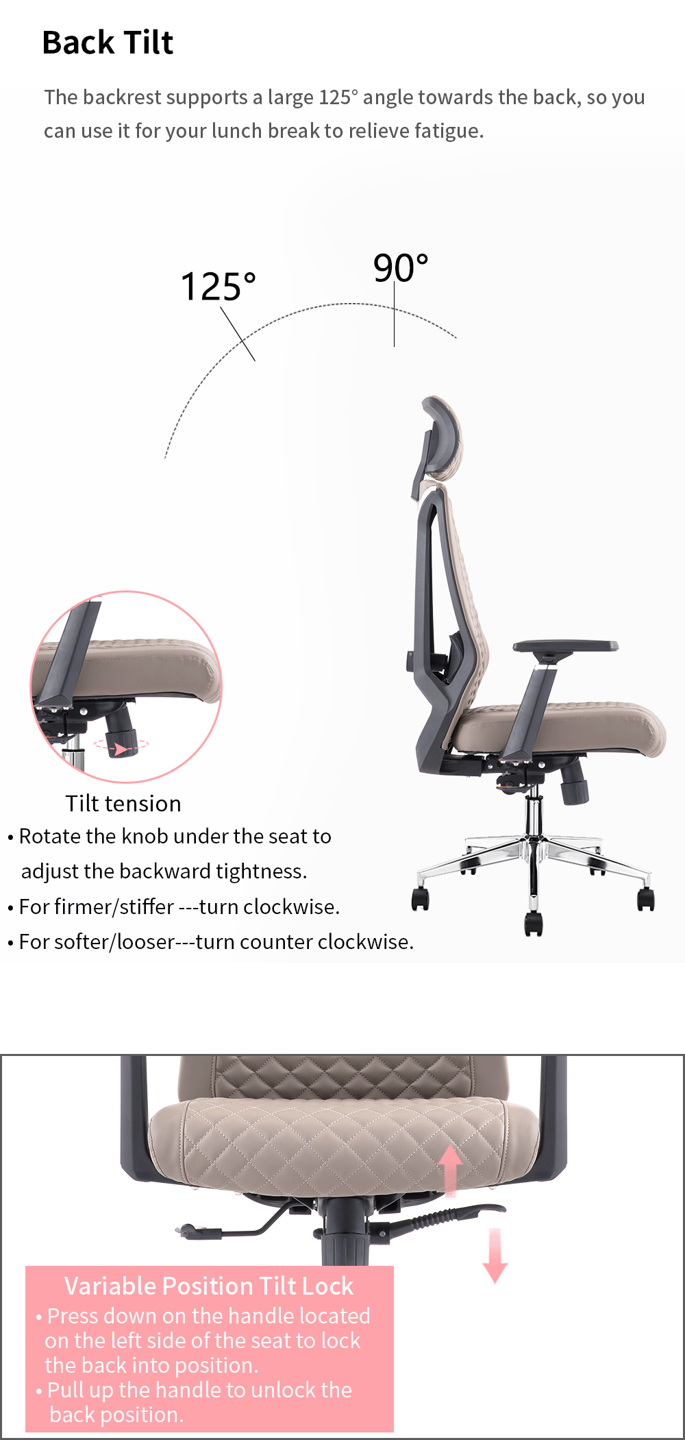 The backrest supports a large 125° angle towards the back, so you can use it for your lunch break to relieve fatigue.