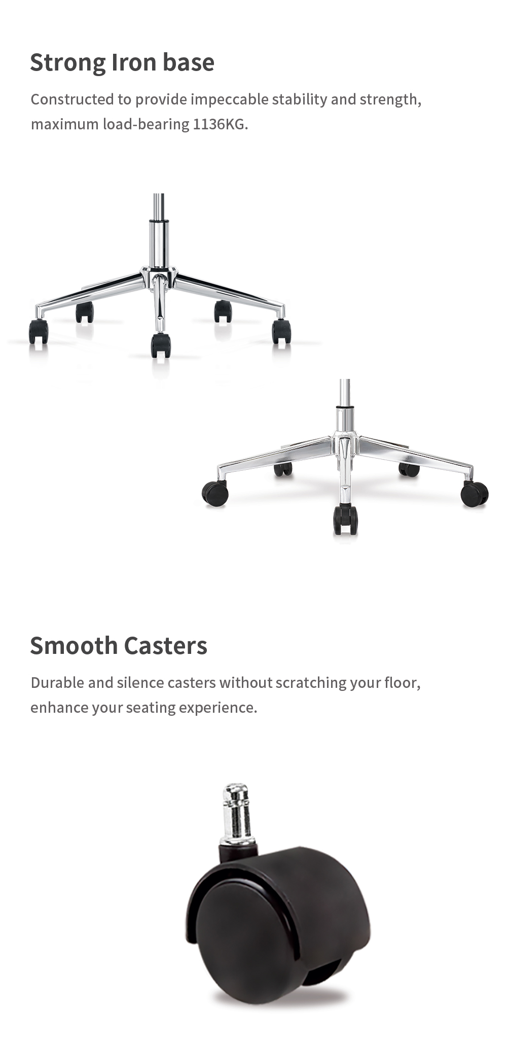 The heavy-duty metal base is steady and durable, having good bearing quality. The 360-degree rotating wheels are quiet and will not scratch the floor when moving.