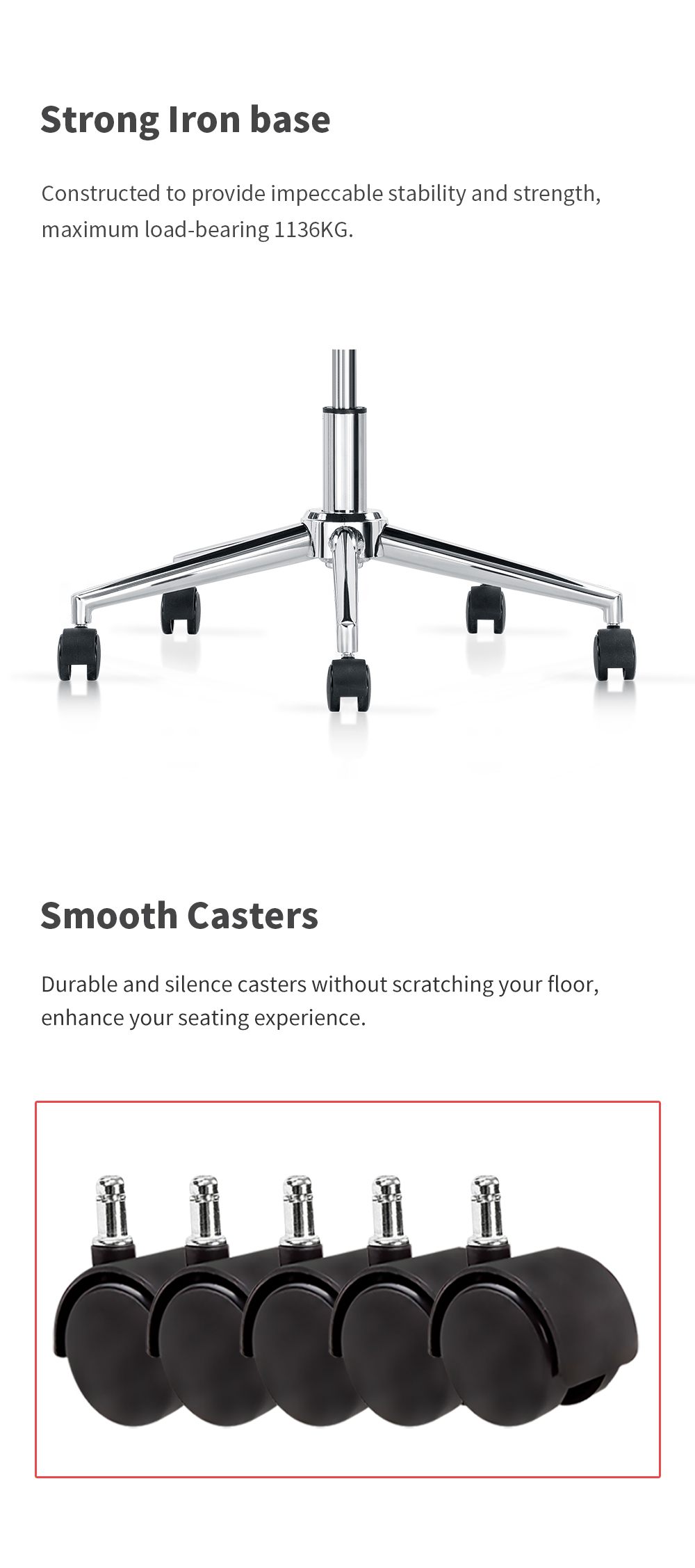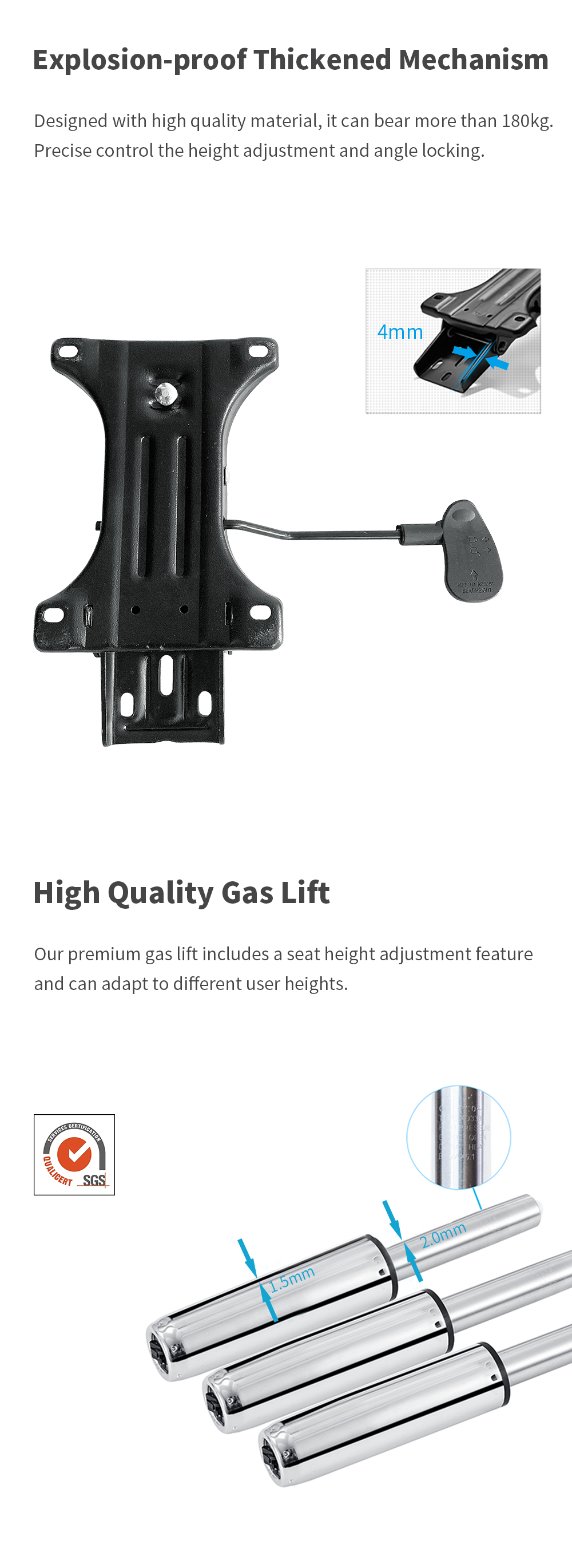 The thickened chassis offers a robust structure with multiple functions, enabling seat height adjustment, tilt level adjustment, and tilt tension adjustment all on the same chassis.
