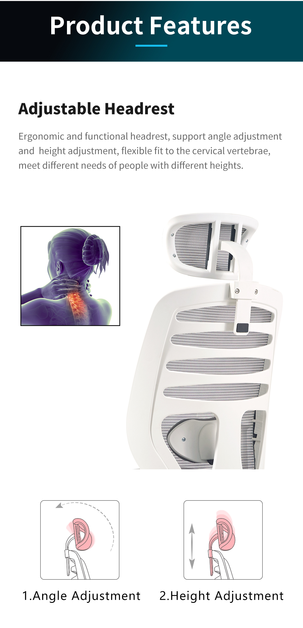 An ergonomic and functional headrest with support angle and height adjustments, offering flexibility to fit different heights and cervical vertebrae needs.