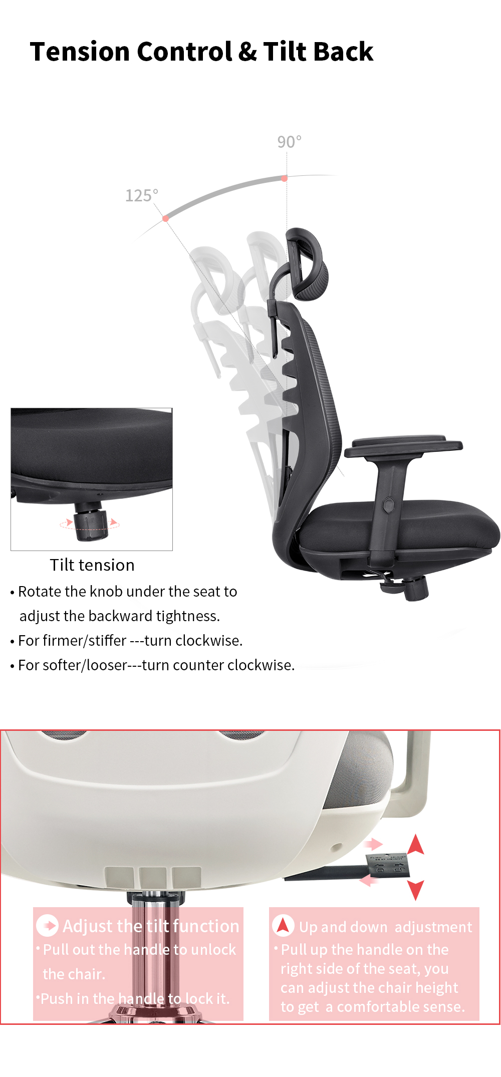 Back Tilt: The backrest can tilt from 90° to 125°, allowing you to find the best angle to suit your needs.
