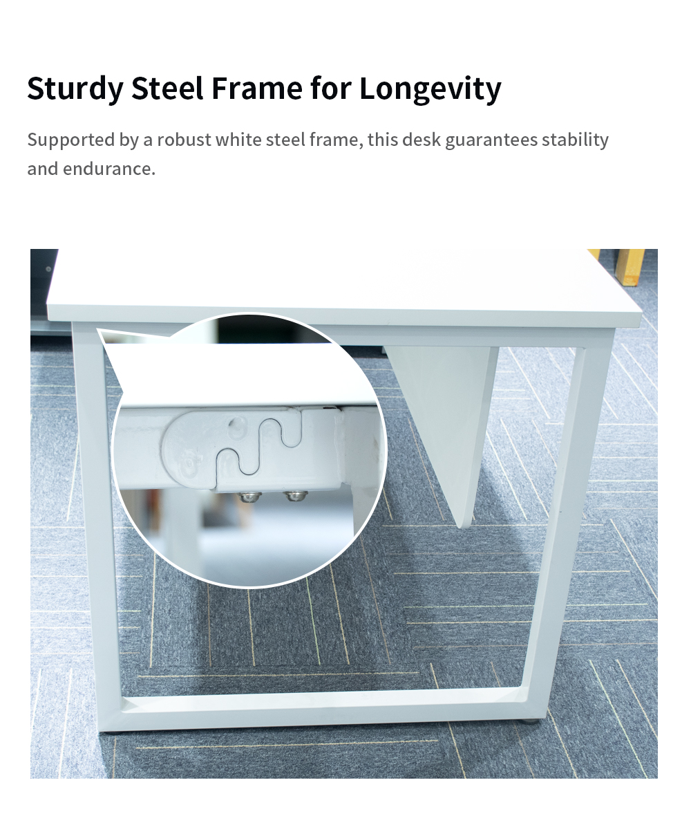 Supported by a robust white steel frame, this desk guarantees stability and endurance.