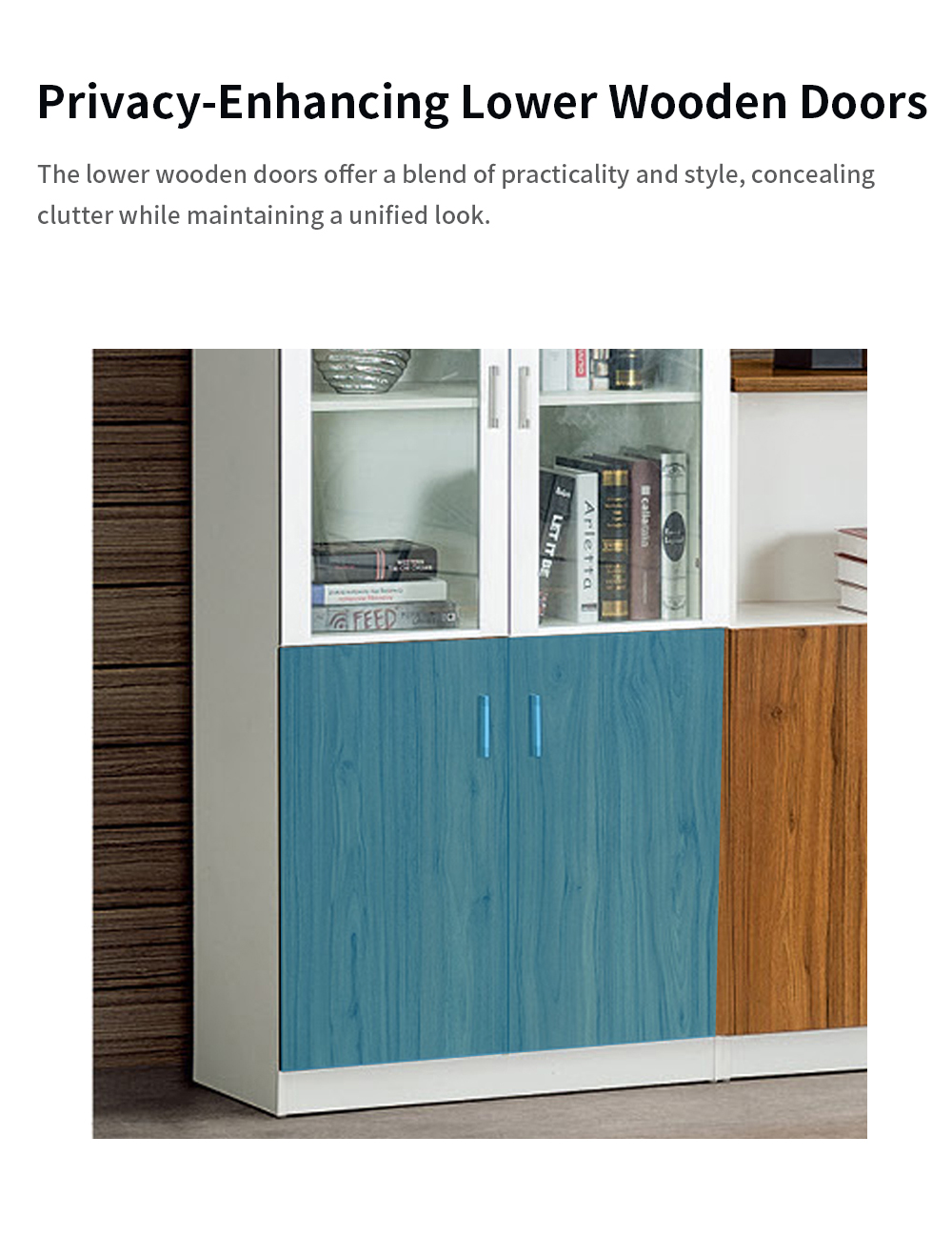 The lower wooden doors offer a blend of practicality and style, concealing clutter while maintaining a unified look.