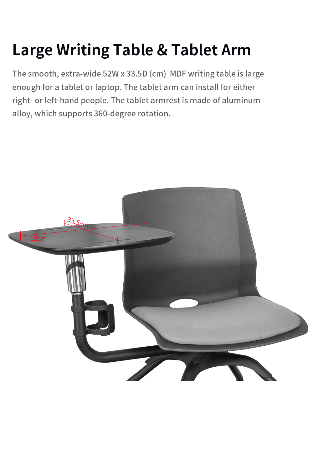 The smooth, extra-wide 52W x 33.5D (cm) MDF writing table is large enough for a tablet or laptop. The tablet arm can install for either right- or left-hand people. The tablet armrest is made of aluminum alloy, which supports 360-degree rotation.