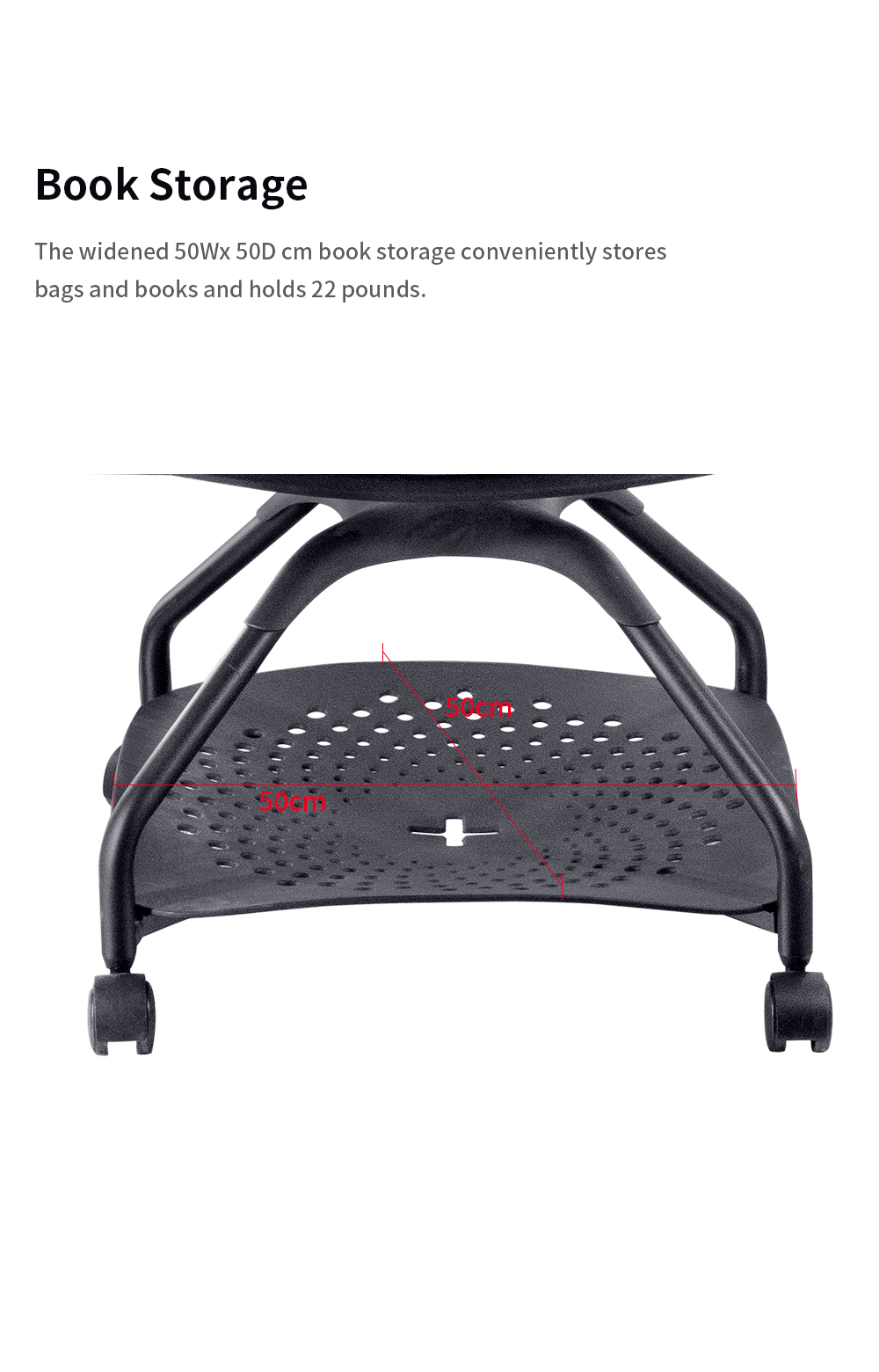 The widened 50Wx 50D cm book storage conveniently stores bags and books and holds 22 pounds.