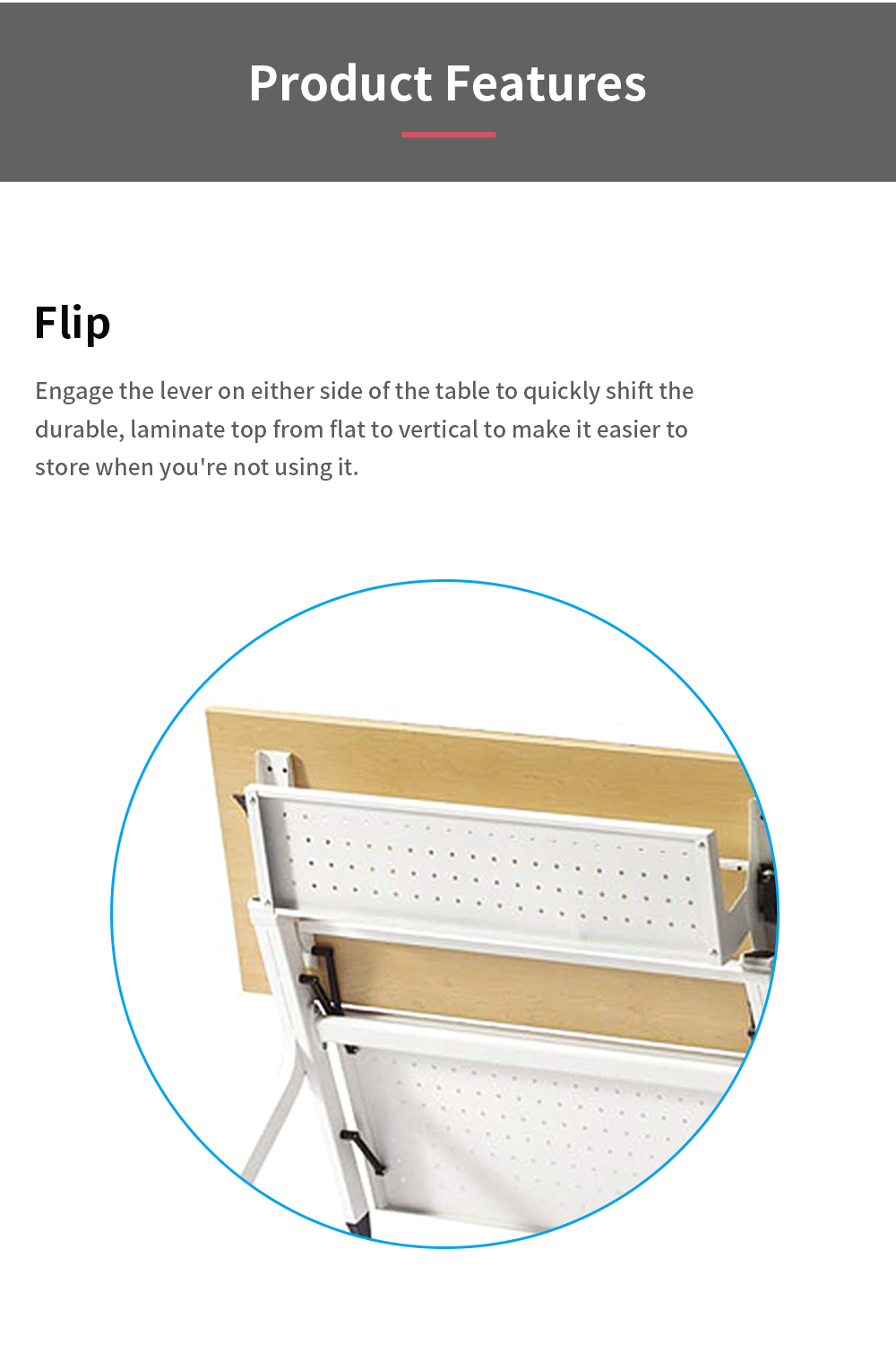 Engage the lever on either side of the table to quickly shift the durable, laminate top from flat to vertical to make it easier to store when you're not using it.