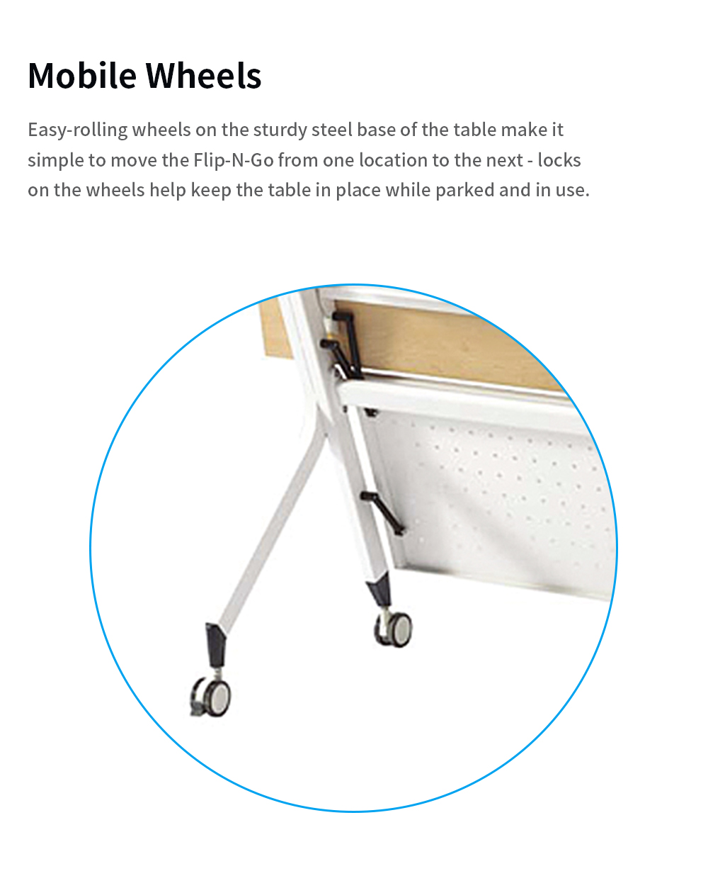 Easy-rolling wheels on the sturdy steel base of the table make it simple to move the Flip-N-Go from one location to the next - locks on the wheels help keep the table in place while parked and in use.