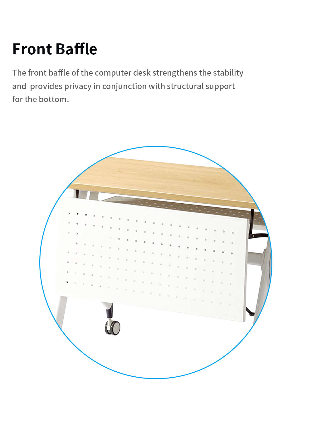 The front baffle of the computer desk strengthens the stability and provides privacy in conjunction with structural support for the bottom.
