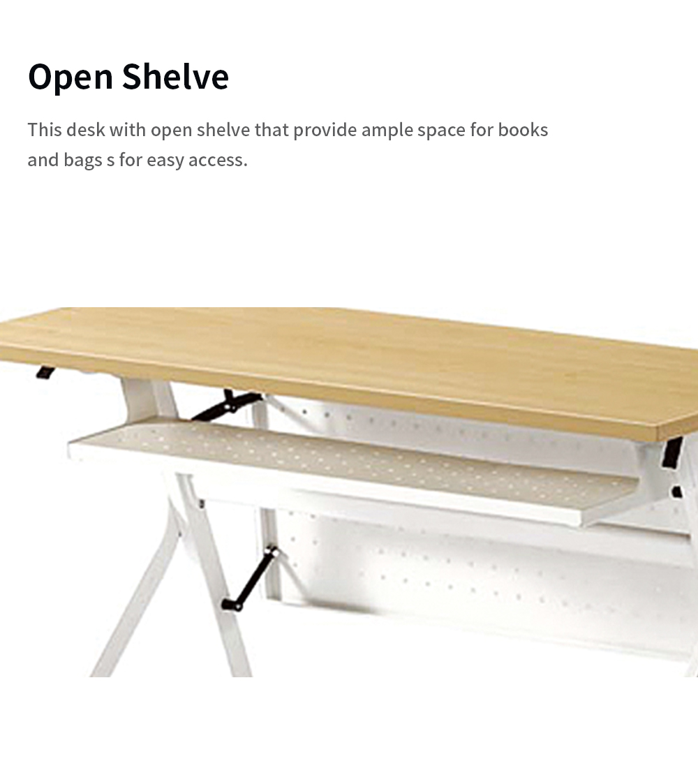 This desk with open shelve that provide ample space for books and bags s for easy access.