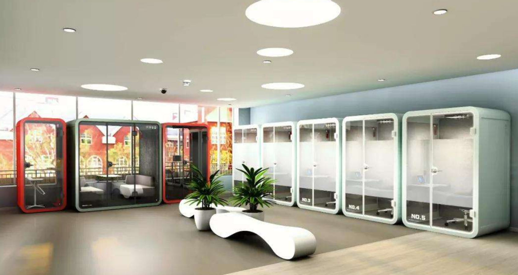 Mute cabins come in various shapes, whether personal workstations, telephone booths, or conference rooms, which are both private and soundproof, allowing for quiet work and meetings.